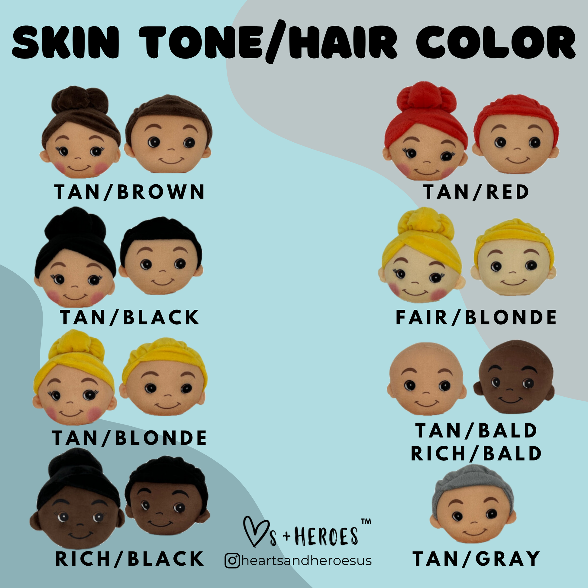 When a loved one is away; Hearts + Heroes dolls are there to stay. Meet our Pilot Doll wearing black slacks, a black suit jacket, a white dress shirt with a black tie. You are able to choose the color of the flight wings and stripes on the Pilot's jacket. See colors in the photos. They are 16 inch plush dolls, and they are the perfect cuddling companion, when your loved one is away. You can choose between Male/Female along with different Skin/Hair tones.